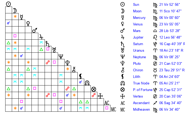 | Neptune | 6 Virgo 9 | 0 Aries 57 | 7 Virgo 58 |