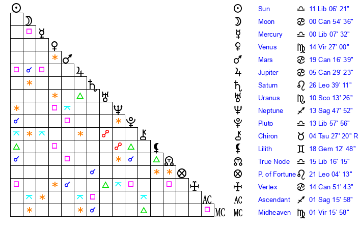 | Venus | 14 Virgo 27 | 18 Virgo 20 | 14 Scorpio 9 |