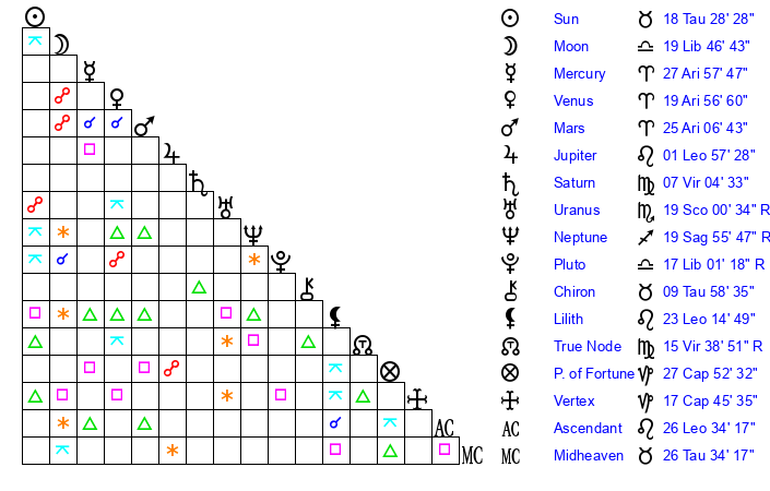 | Moon | 19 Libra 46 | 16 Libra 39 | 4 Cancer 52 |