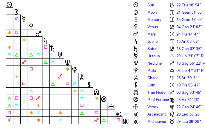 | Moon | 21 Gemini 40 | 4 Sagittarius 13 | 21 Aries 18 |