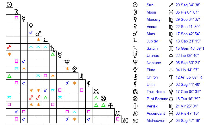 | Neptune | 5 Sagittarius 32 | 27 Pisces 8 | 7 Sagittarius 5 |