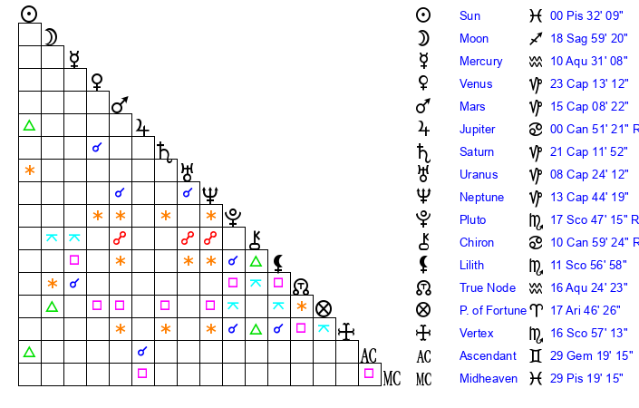 Moon | 18 Sagittarius 51 | 16 Scorpio 55 | 0 Aries 27 |