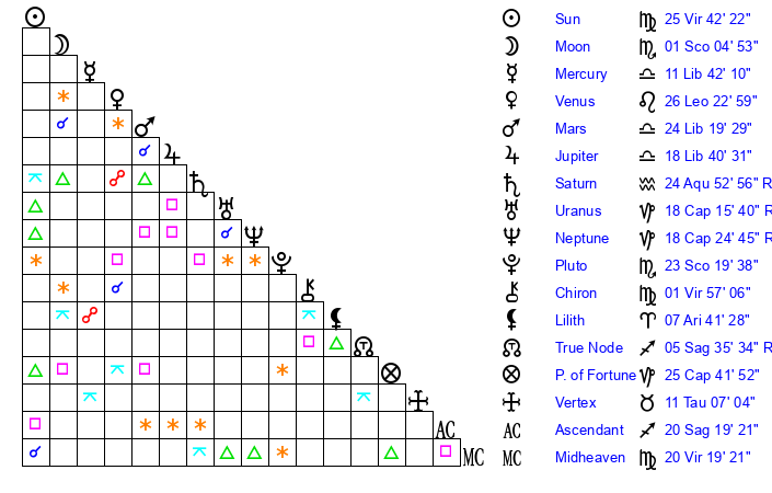 | Mercury | 11 Libra 42 | 0 Libra 22 | 20 Scorpio 50 |