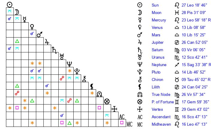 | Mercury | 23 Leo 58 | 9 Leo 26 | 17 Libra 38 |