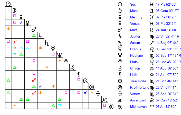 | Venus | 8 Pisces 32 | 9 Aries 55 | 2 Gemini 46 |
