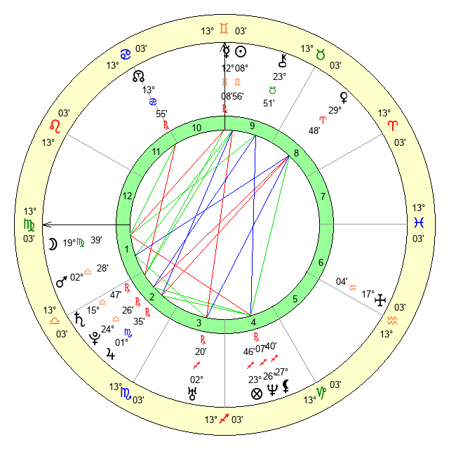 | Moon | 19 Virgo 46 | 28 Cancer 11 | 2 Aries 6 |