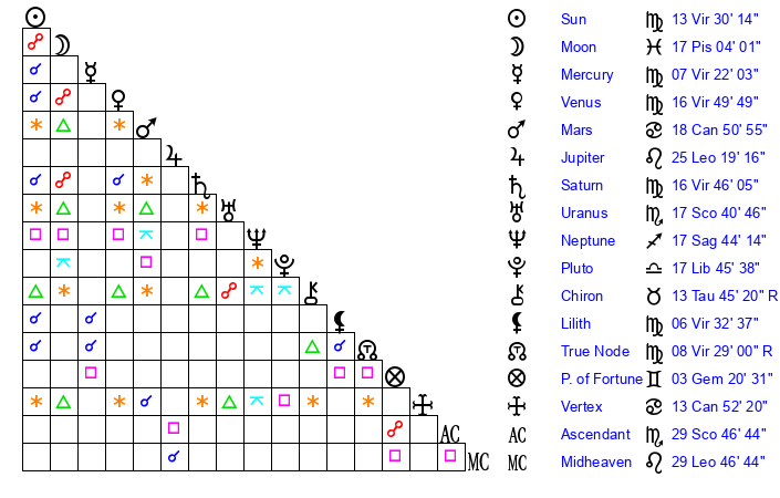 | Saturn | 17 Virgo 7 | 29 Pisces 29 | 22 Virgo 40 |