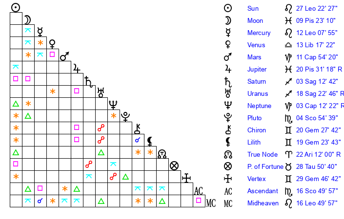 | Moon | 9 Pisces 19 | 26 Cancer 17 | 3 Leo 42 |