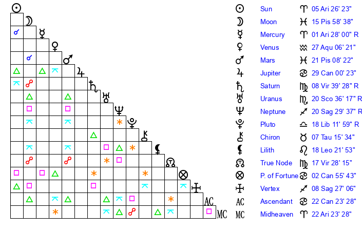 | Pluto | 18 Libra 12 | 3 Aquarius 27 | 16 Libra 59 |