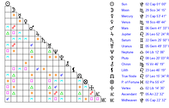 | Moon | 29 Scorpio 31 | 25 Aquarius 42 | 29 Scorpio 9 |