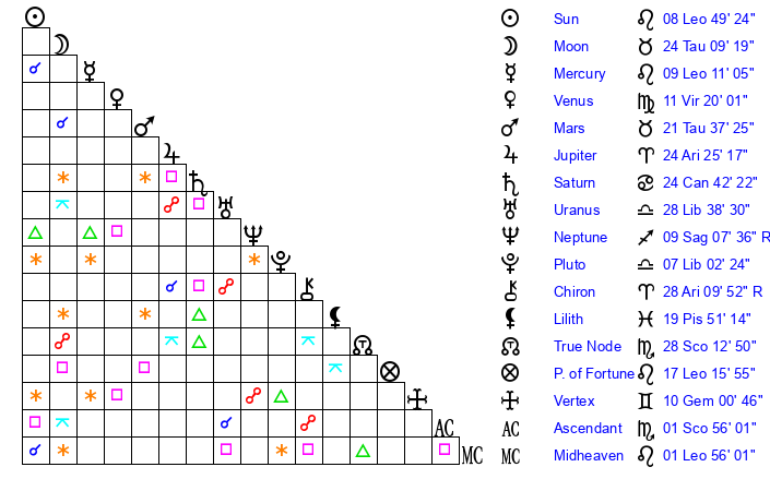 | Moon | 24 Taurus 1 | 11 Scorpio 41 | 29 Pisces 29 |