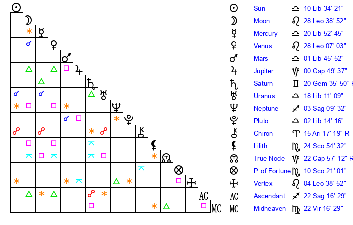 | Moon | 28 Leo 31 | 24 Aquarius 48 | 8 Leo 24 |
