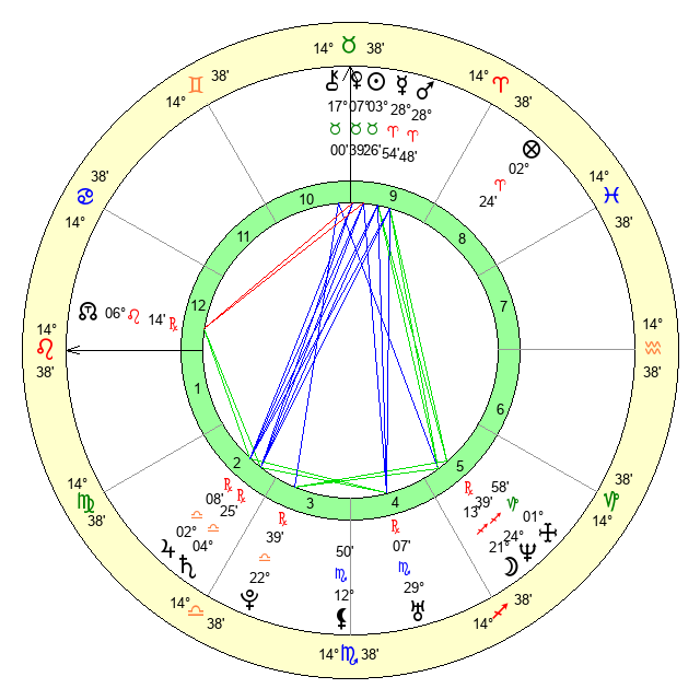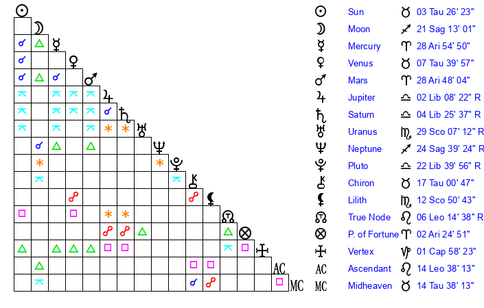 | Moon | 21 Sagittarius 10 | 6 Pisces 54 | 12 Leo 46 |
