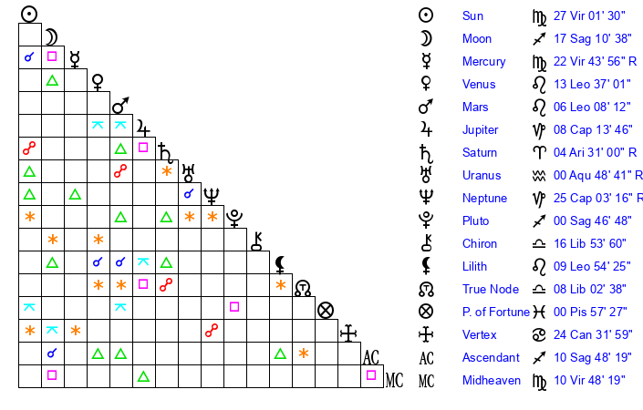| Sun | 27 Virgo 1 | 27 Virgo 0 | 25 Libra 36 |