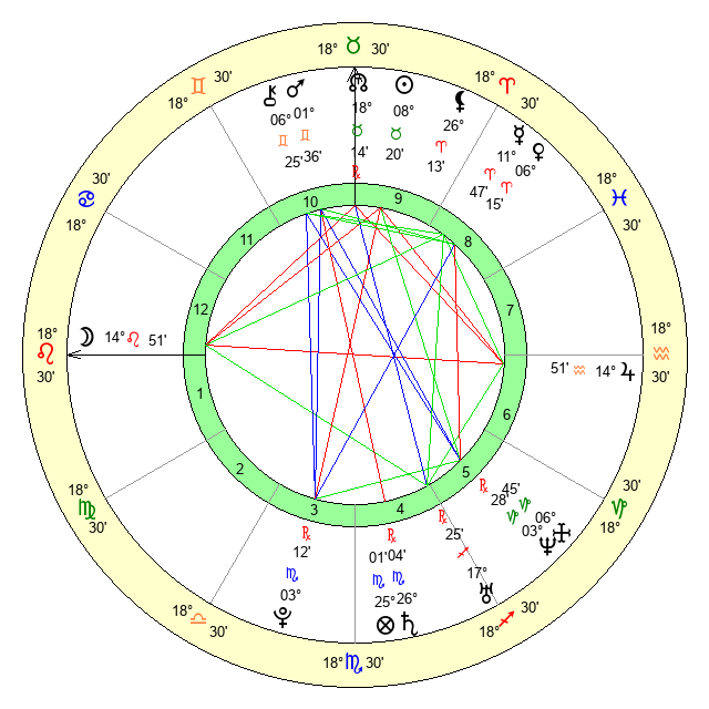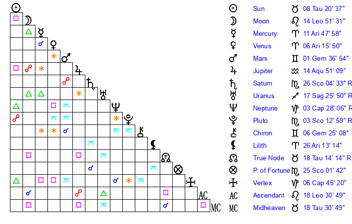 | Moon | 14 Leo 49 | 21 Taurus 28 | 16 Aquarius 16 |
