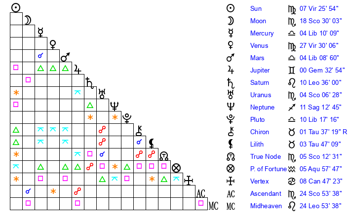 | Venus | 27 Virgo 30 | 6 Leo 0 | 27 Scorpio 33 |