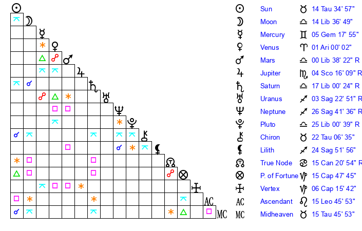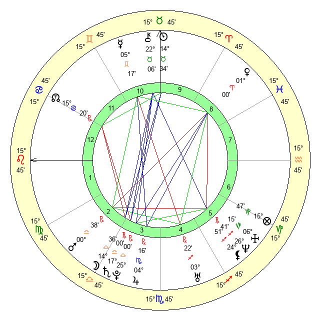 | Moon | 14 Libra 31 | 25 Leo 5 | 29 Aries 12 |