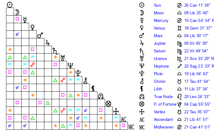 | Sun | 26 Cancer 12 | 26 Cancer 19 | 9 Virgo 24 |