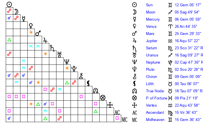 | Jupiter | 16 Aquarius 56 | 28 Gemini 23 | 14 Aquarius 46 |
