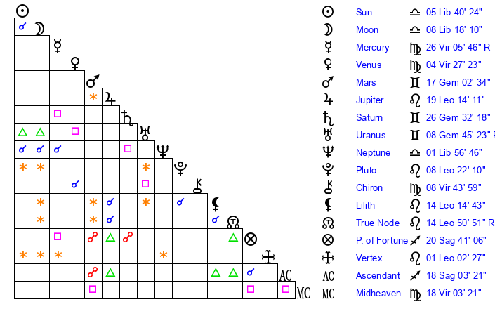 | Moon | 8 Libra 25 | 3 Capricorn 34 | 7 Libra 31 |