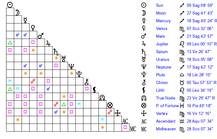 | Moon | 27 Sagittarius 30 | 23 Aries 53 | 14 Virgo 40 |