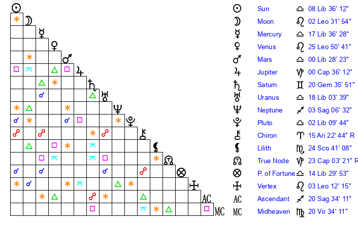 | Neptune | 3 Sagittarius 6 | 0 Aries 31 | 4 Sagittarius 50 |