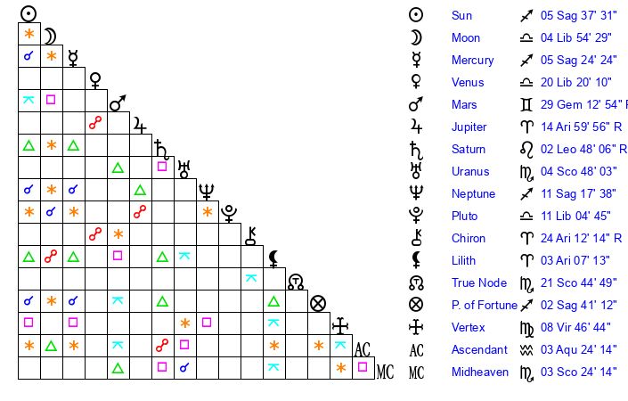 | Mars | 29 Gemini 13 | 17 Sagittarius 27 | 14 Gemini 48 |
