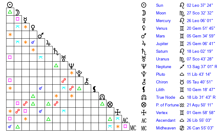 | Moon | 27 Scorpio 33 | 14 Leo 26 | 28 Leo 3 |