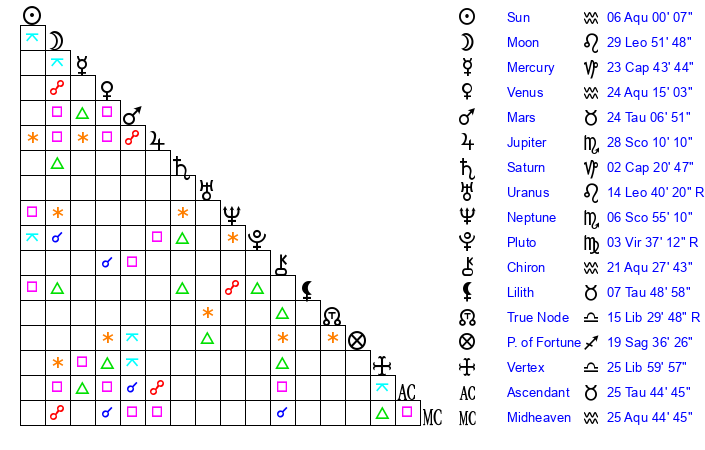| Moon | 29 Leo 47 | 1 Capricorn 41 | 10 Aquarius 0 |