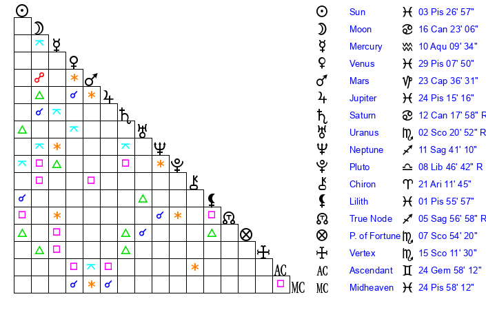 | Saturn | 12 Cancer 40 | 19 Pisces 51 | 13 Cancer 8 |