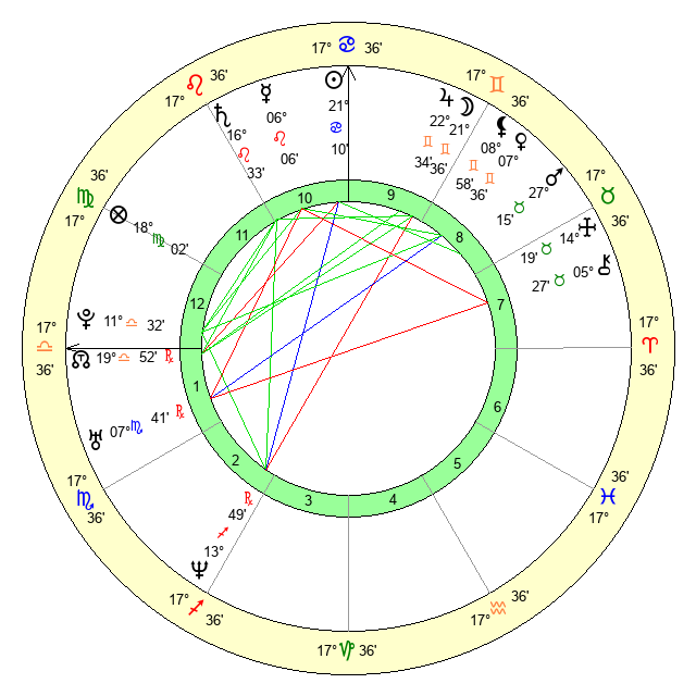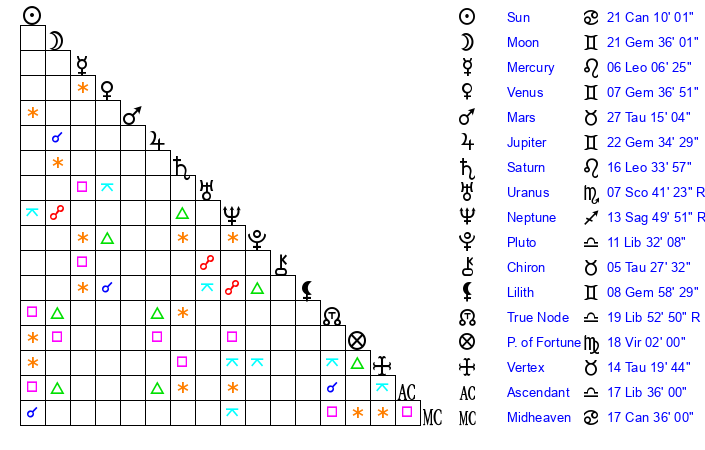 | Sun | 21 Cancer 10 | 21 Cancer 33 | 7 Virgo 11 |