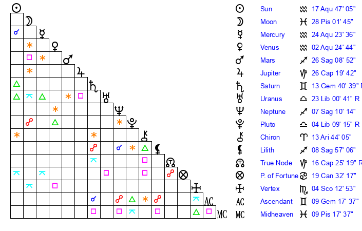 | Sun | 17 Aquarius 46 | 18 Aquarius 9 | 9 Aries 51 |