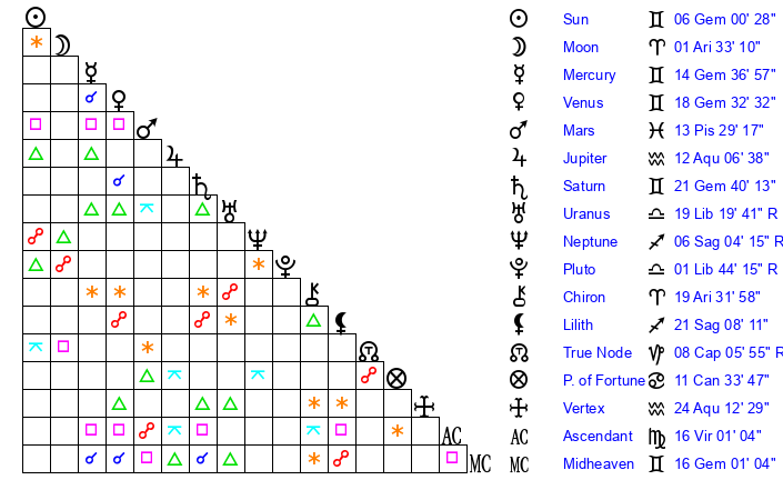 | Moon | 1 Aries 22 | 11 Gemini 8 | 28 Aquarius 56 |