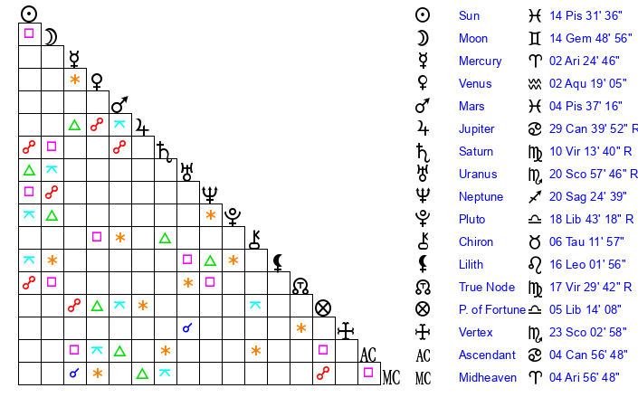 | Moon | 14 Gemini 52 | 2 Gemini 39 | 12 Aquarius 23 |
