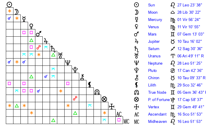 | Neptune | 28 Leo 52 | 1 Aries 37 | 1 Virgo 22 |