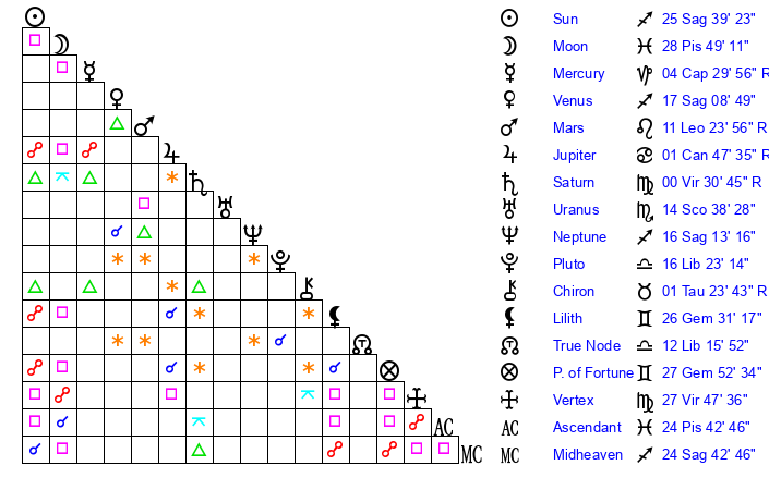 | Moon | 28 Pisces 50 | 26 Cancer 16 | 5 Sagittarius 56 |