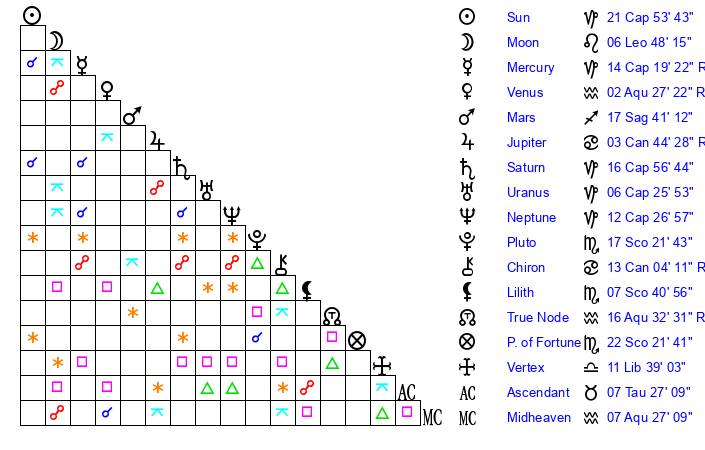 Sun | 21 Capricorn 54 | 22 Capricorn 24 | 27 Aquarius 25 |