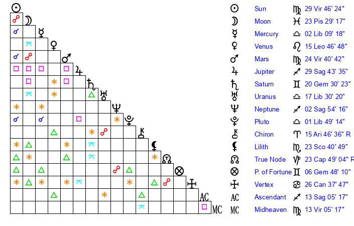 | Neptune | 2 Sagittarius 53 | 0 Aries 46 | 4 Sagittarius 30 |