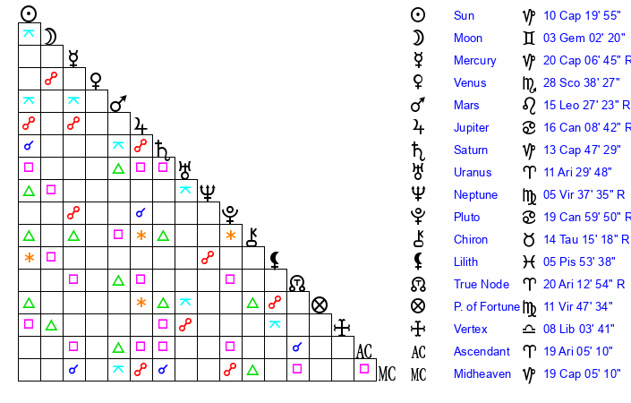 | Moon | 3 Gemini 3 | 3 Aquarius 26 | 24 Scorpio 12 |