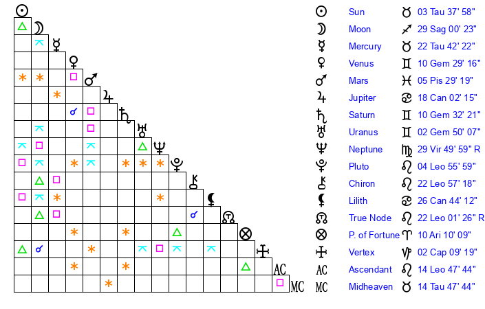| Moon | 28 Sagittarius 59 | 21 Pisces 16 | 26 Sagittarius 47 |
