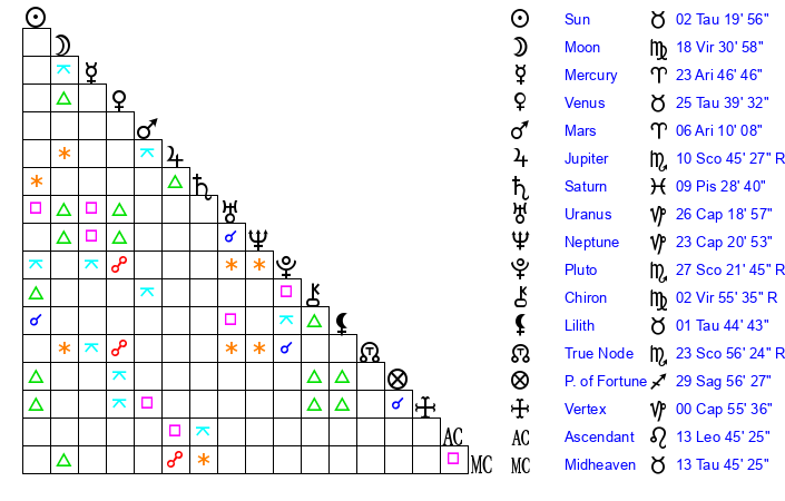 | Moon | 18 Virgo 34 | 22 Aquarius 59 | 12 Scorpio 3 |