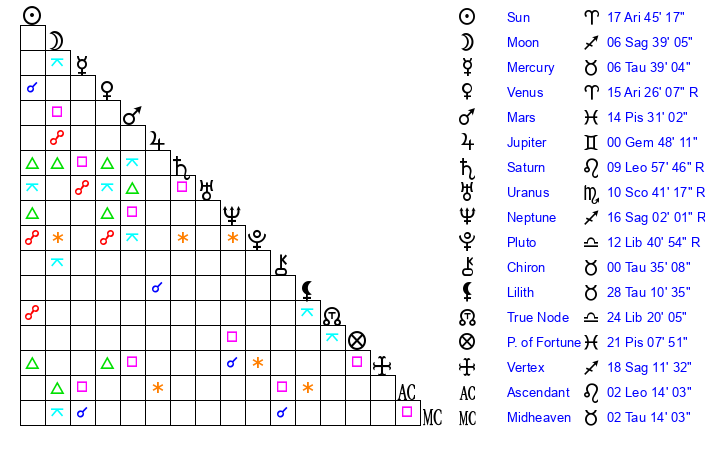 | Sun | 17 Aries 45 | 18 Aries 7 | 4 Gemini 21 |