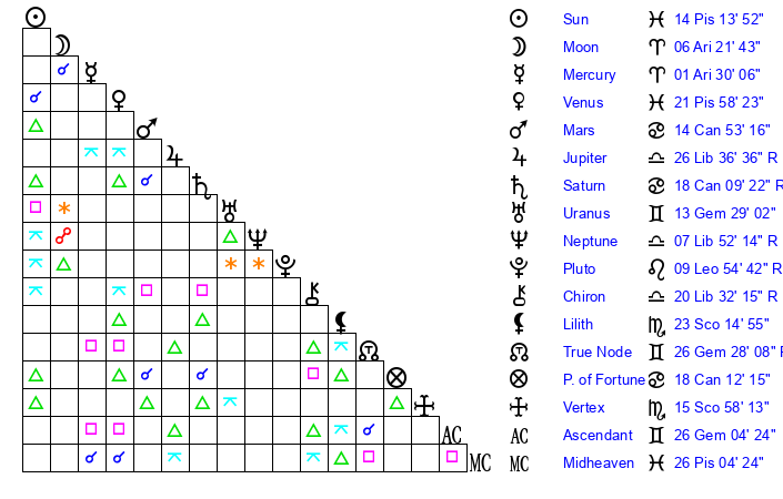 Sun | 14 Pisces 14 | 15 Pisces 5 | 1 Gemini 40 |