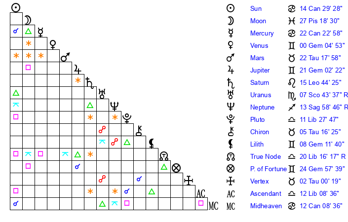 | Moon | 27 Pisces 24 | 27 Scorpio 25 | 22 Sagittarius 30 |