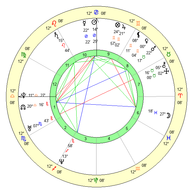 | Sun | 14 Cancer 29 | 14 Cancer 52 | 0 Virgo 26 |