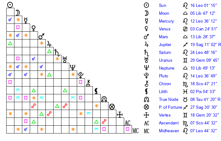 | Pluto | 14 Leo 36 | 2 Aquarius 14 | 16 Leo 25 |