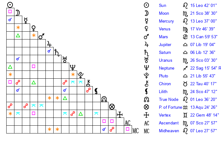 | Pluto | 21 Libra 56 | 2 Aquarius 15 | 23 Libra 15 |