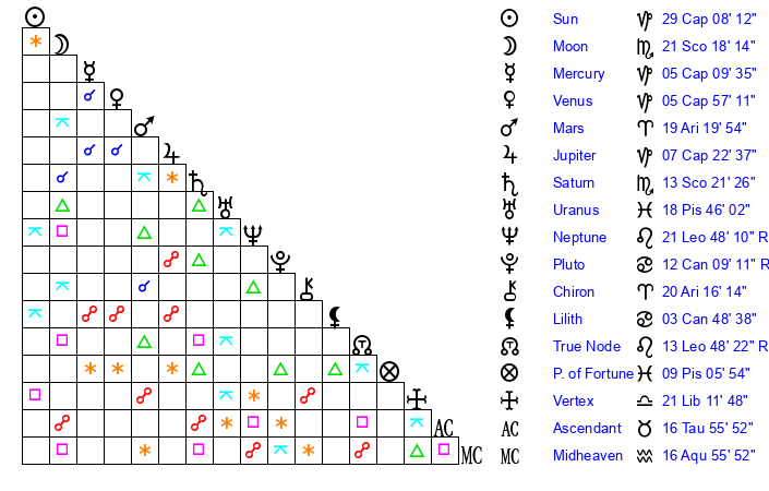 | Saturn | 13 Scorpio 53 | 16 Pisces 5 | 11 Scorpio 46 |