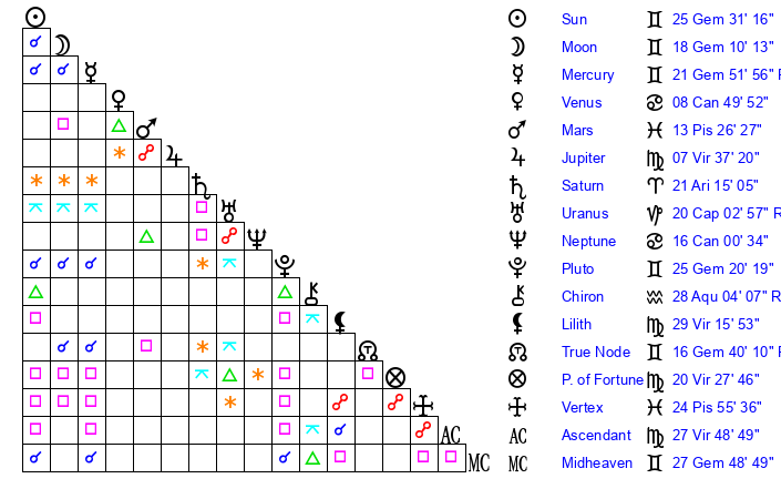 Sun | 25 Gemini 32 | 26 Gemini 27 | 17 Libra 26 |