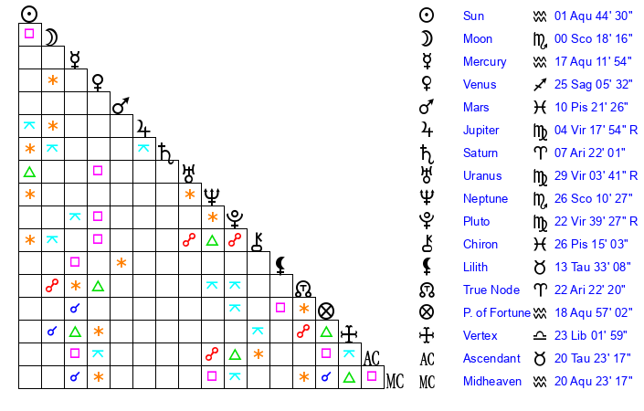 | Moon | 0 Scorpio 18 | 12 Scorpio 2 | 5 Sagittarius 59 |